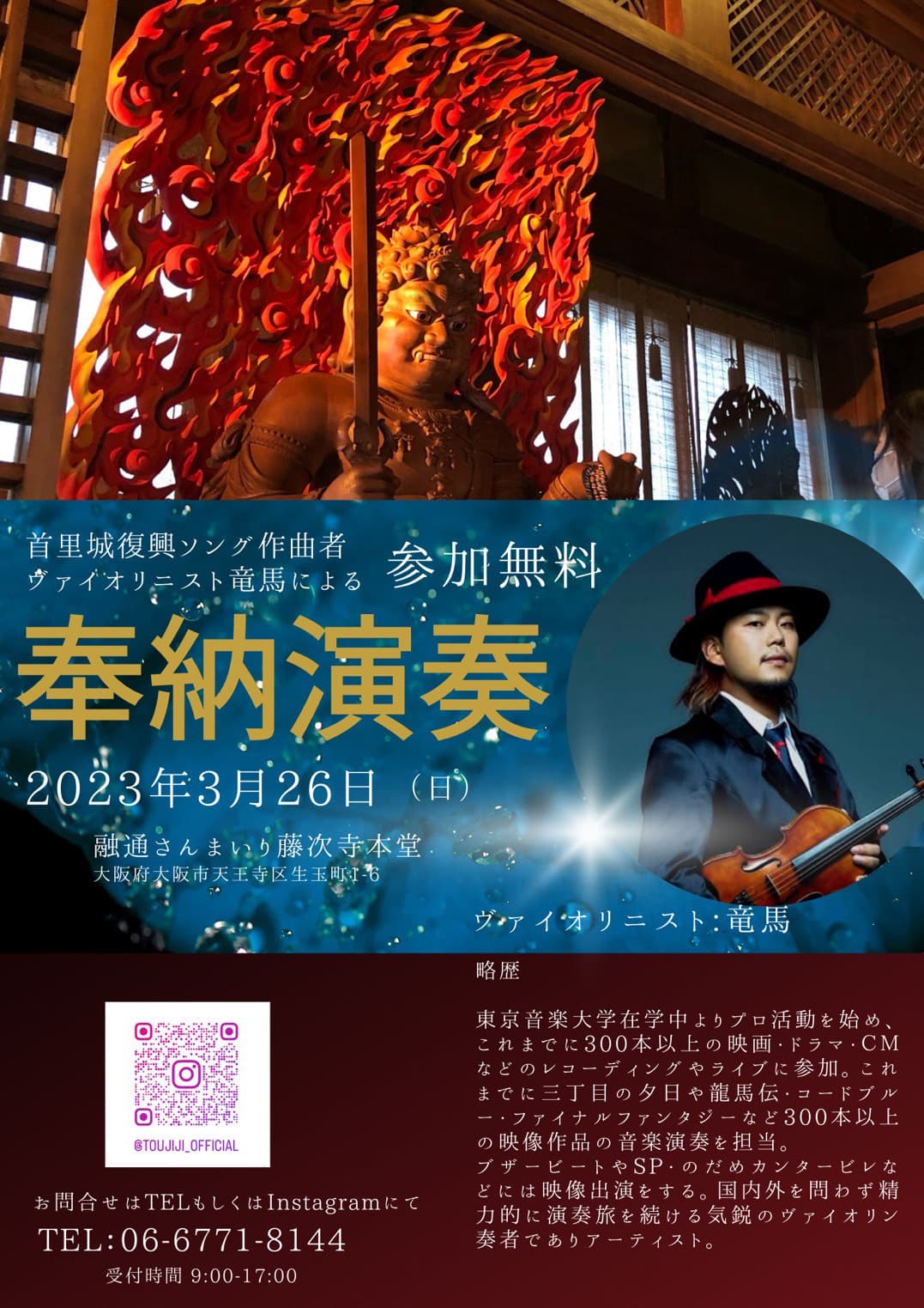 この度ヴァイオリニスト竜馬さんの奉納演奏を開催いたします。